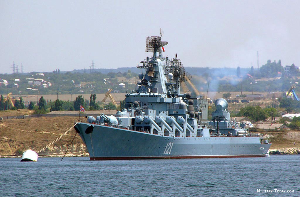 | Tuy nhiên, tàu chiến Nga lại có lợi thế vượt trội về khả năng chống hạm. Tuần dương hạm mang tên lửa điều khiển Moskva lớp Slava là một ví dụ điển hình. Nó mang theo tới 16 tên lửa chống hạm hạng nặng P-500 Bazalt, pháo hạm nòng kép 130 mm. |