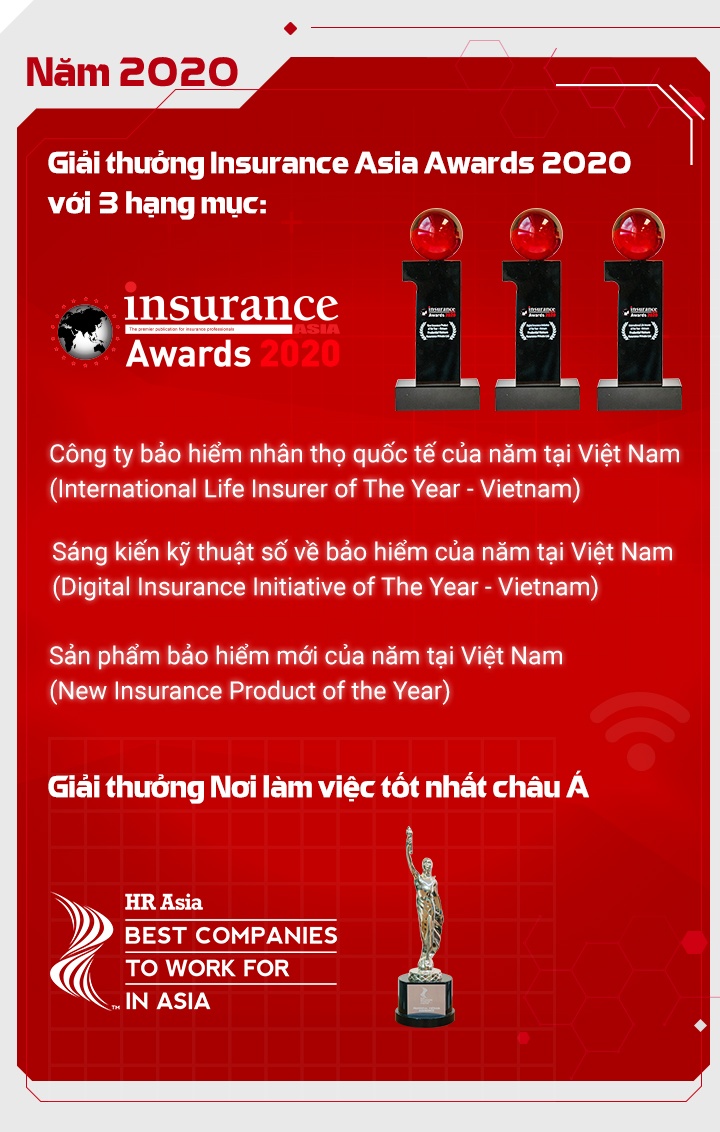 Gần đây nhất là loạt giải thưởng từ Insurance Asia Awards 2020 gồm Sáng kiến kỹ thuật số về bảo hiểm của năm tại Việt Nam (Digital Insurance Initiative of The Year - Vietnam), Sản phẩm bảo hiểm mới của năm tại Việt Nam (New Insurance Product of the Year) và Công ty bảo hiểm nhân thọ quốc tế của năm tại Việt Nam (International Life Insurer of The Year - Vietnam).