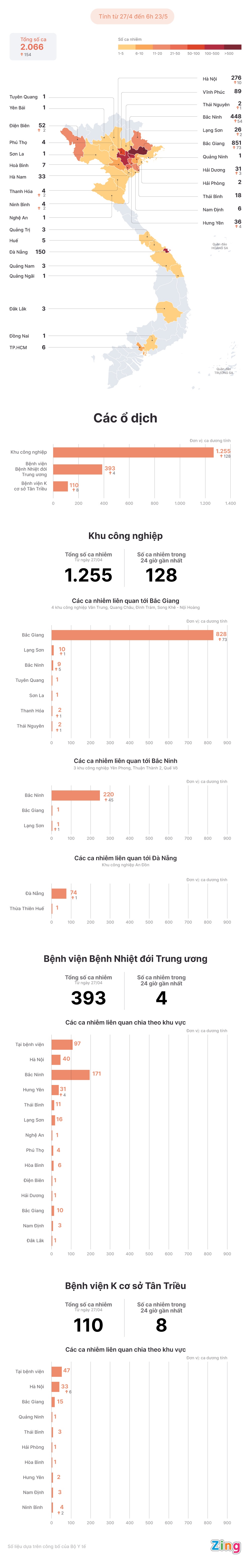 Từ 27/4 đến nay, ổ dịch Covid-19 tại các khu công nghiệp ở Bắc Giang, Bắc Ninh, Đà Nẵng có tổng cộng 1.255 người. Hầu hết ca mới thuộc diện đã cách ly.
