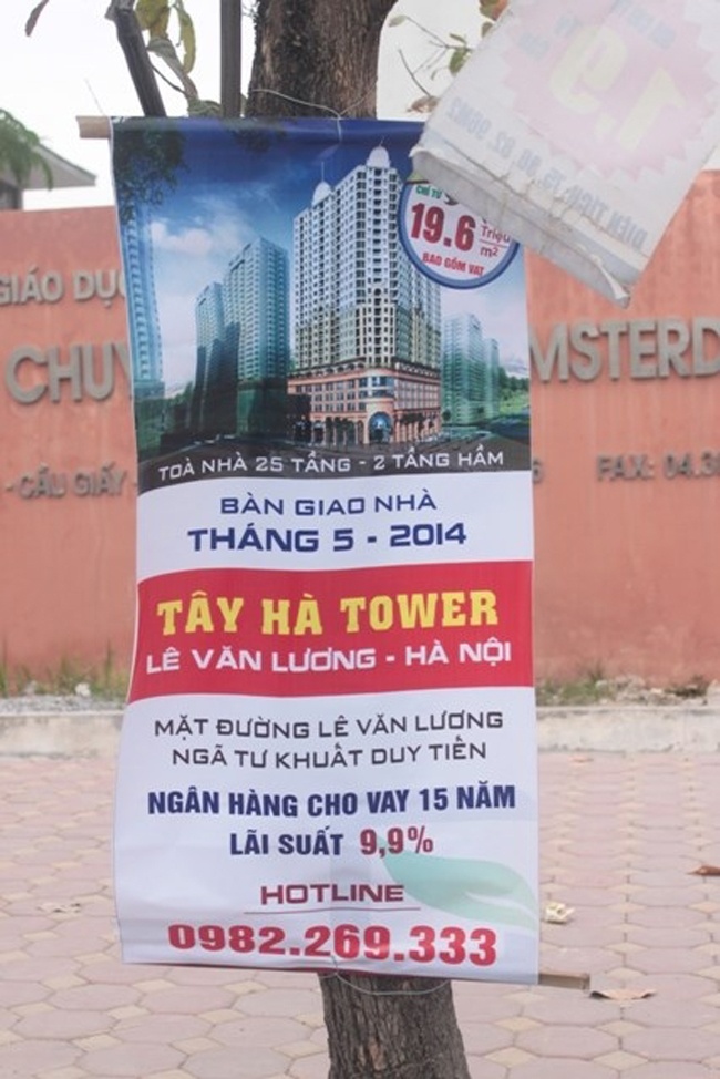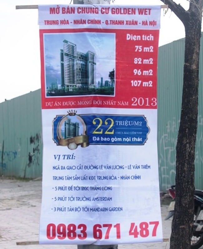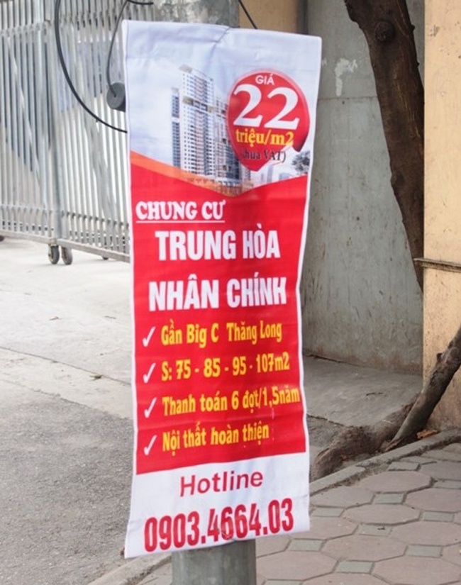 | Băng-rôn chào bán chung cư Trung Hòa Nhân Chính vừa được treo lên. |