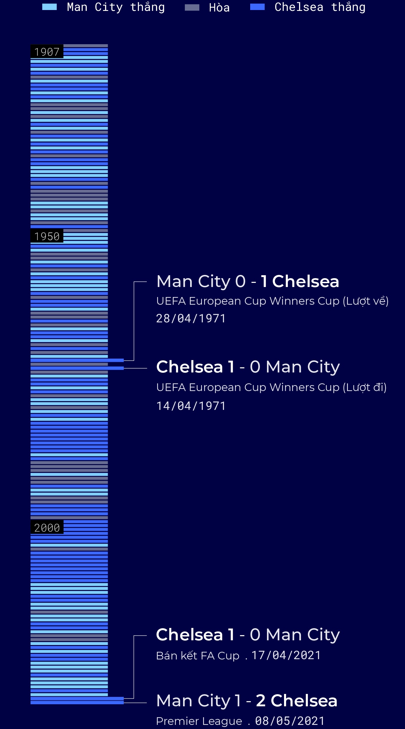 Một thống kê khác có thể khiến các cổ động viên Chelsea lo lắng. Đó là “The Blues” đã thua 8 trận chung kết kể từ năm 2015. Tỷ lệ này chênh lệch nhiều với thành tích của Man City kể từ khi Pep đến.
