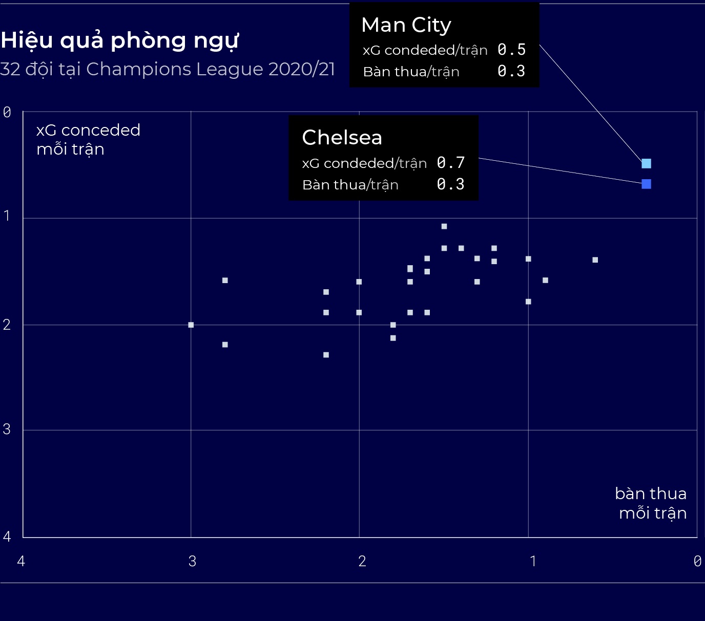 Man City và Chelsea chỉ để thủng lưới mỗi đội 4 bàn tại Champions League mùa này. Không trận nào hai đội để thủng lưới quá 1 bàn. Đây là hai đội có hàng thủ tốt nhất Champions League mùa này.