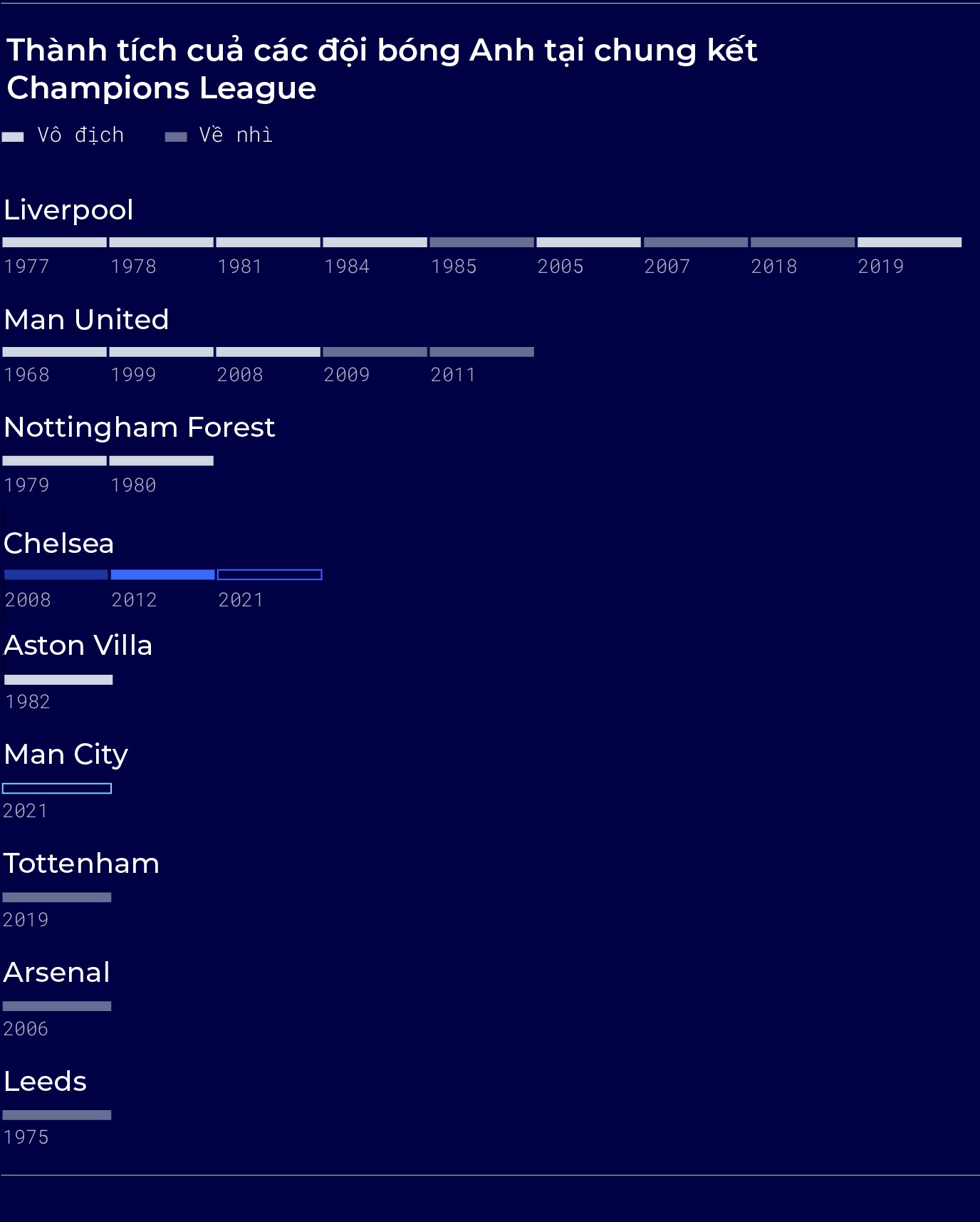Man City là đội bóng Anh thứ 9 góp mặt trong một trận chung kết Champions League, sau Liverpool, Manchester United, Leeds, Nottingham Forest, Aston Villa, Arsenal, Chelsea và Tottenham.