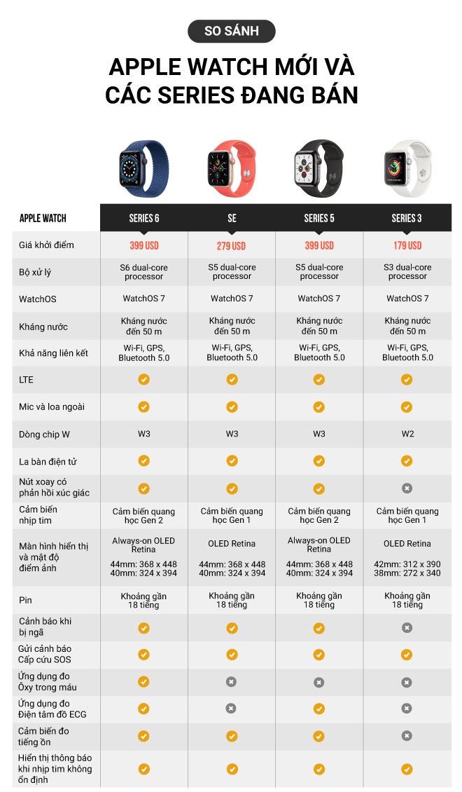 Apple Watch Series 3 đang là model rẻ nhất thị trường, trong khi mẫu series 6 có bổ sung những tính năng mới thú vị.