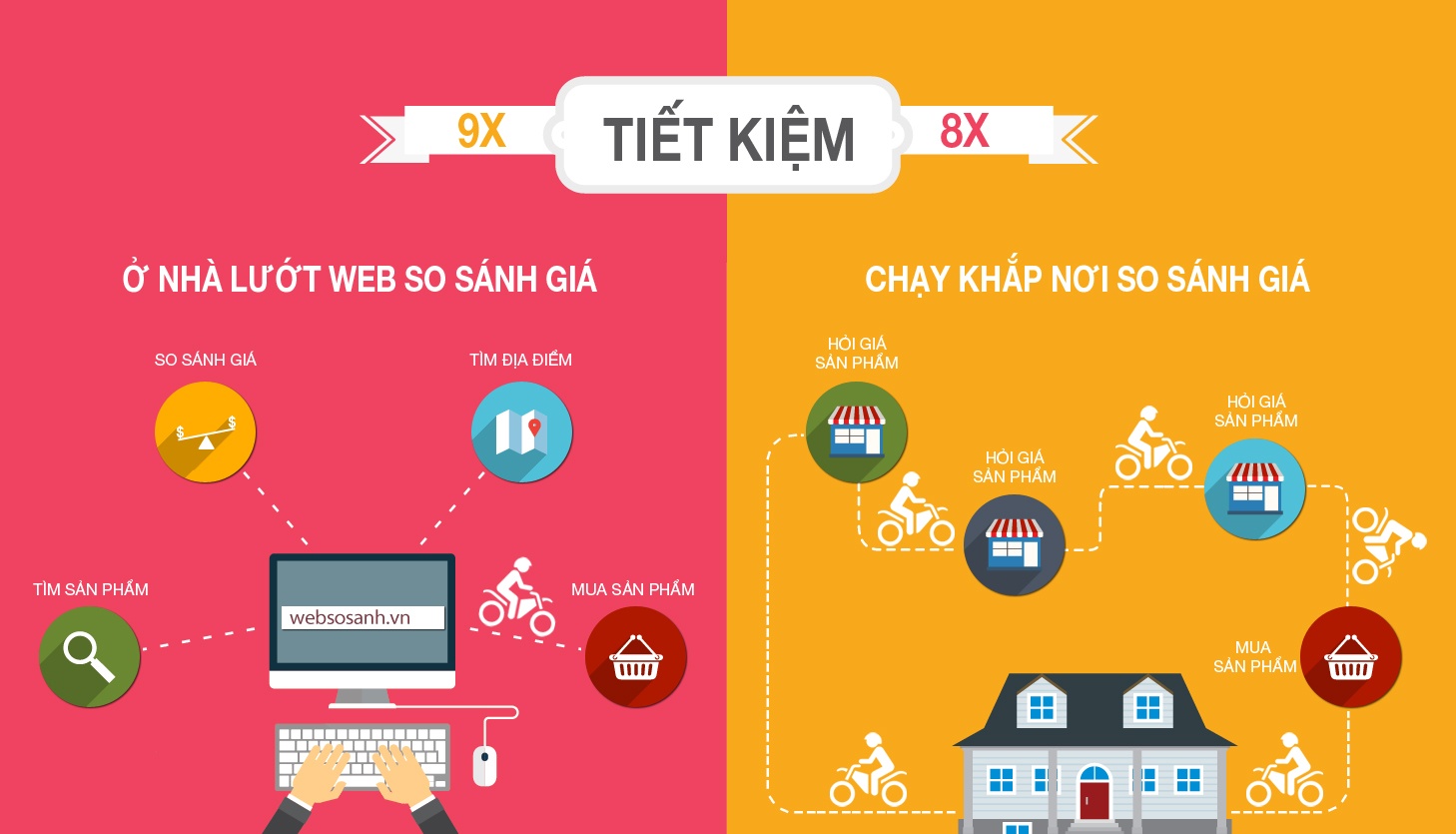 9x đi shopping, cần tìm nơi bán rẻ, vô mạng vào www.websosanh.vn, gõ tên hàng cần mua để ngồi đọc bảng so sánh giá đã được liệt kê đầy đủ, mất khoảng 1 phút để xem giá 100 bên. 8x cần tìm nơi bán rẻ, chạy xe khắp đường từ cửa hàng này qua cửa hàng khác, hỏi cả ngày được tổng cộng hơn 10 bên, nhưng mệt.