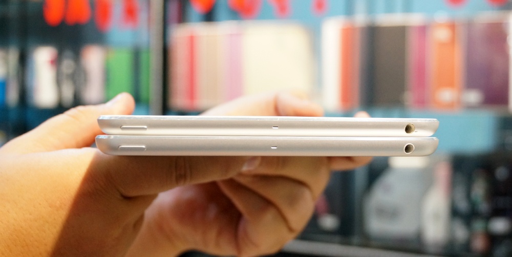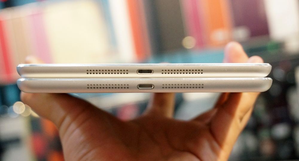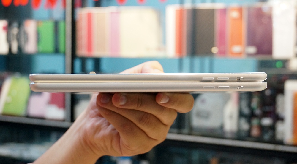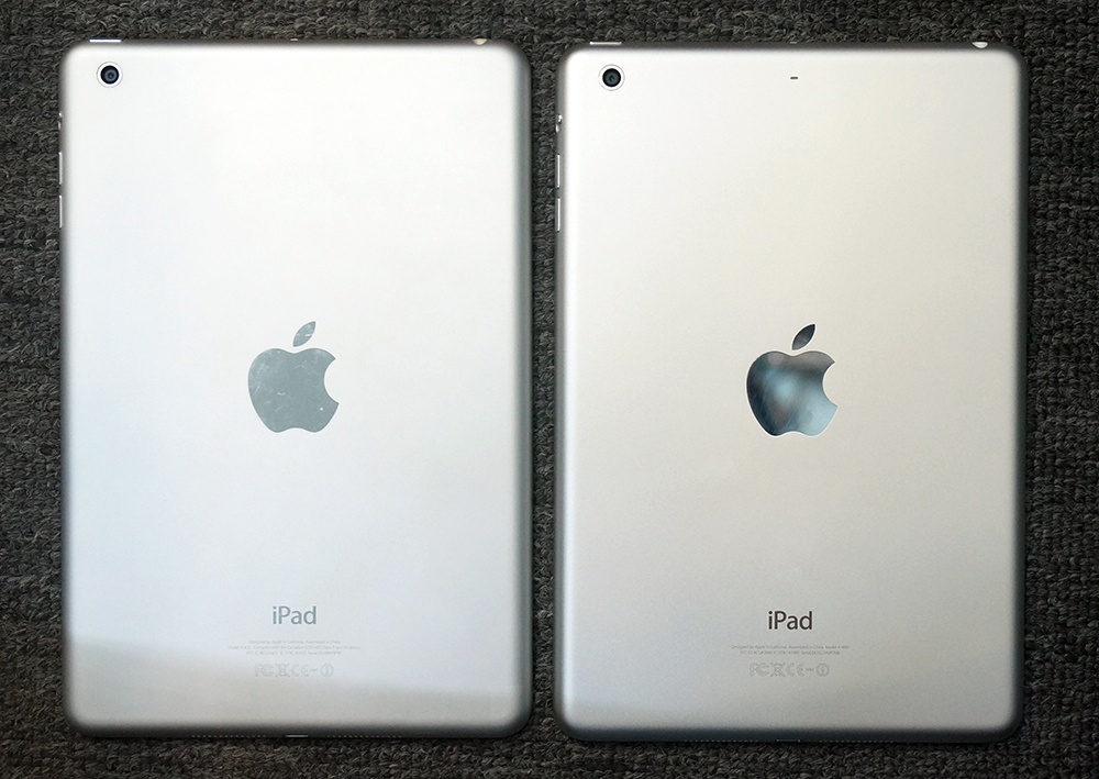 | Mặt trước của iPad Mini (trái) và iPad Mini Retina (phải) giống hệt nhau. |