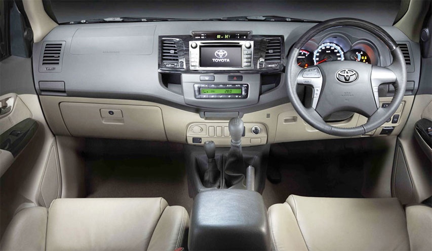 Khoang cabin của Fortuner 2016 mang phong cách của dòng xe du lịch hiện đại với nhiều tính năng tiện ích và trang bị an toàn. Một vài tính năng điển hình có thể kể đến như keyless entry với nút khởi động, hệ thống thông tin giải trí màn hình cảm ứng cỡ lớn kèm định vị, camera đa góc, 7 túi khí gồm túi khí đầu gối người lái, ghế ngồi bọc da, kiểm soát nhiệt độ tự động, hỗ trợ đổ đèo, kiểm soát ổn định xe, kiểm soát trượt và la-zăng hợp kim 18 inch.