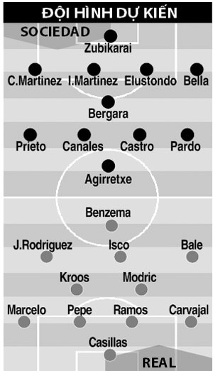 Ở trận này, dù thiếu vắng Ronaldo do chấn thương, nhưng điều đó có lẽ cũng không ảnh hưởng nhiều đến Real Madrid, khi mà đối thủ của họ chỉ là một Sociedad đang bết bát. Trước một đối thủ vốn được xem là “bia tập bắn”, những chân sút còn lại của HLV Carlo Ancelotti như Benzema hay Gareth Bale, James Rodriguez, Isco… cũng dư sức làm tung lưới hàng thủ lỏng lẻo đến mức để thủng lưới 6 trong 8 trận gần đây của Sociedad.