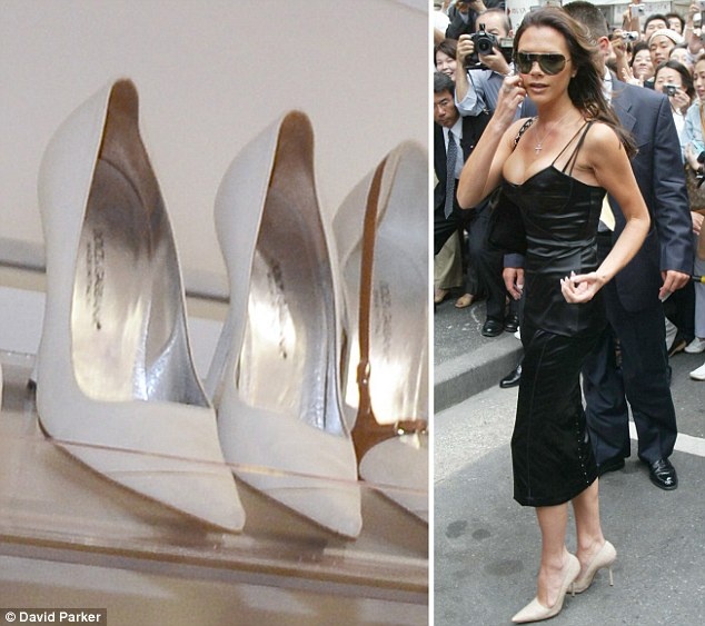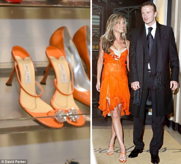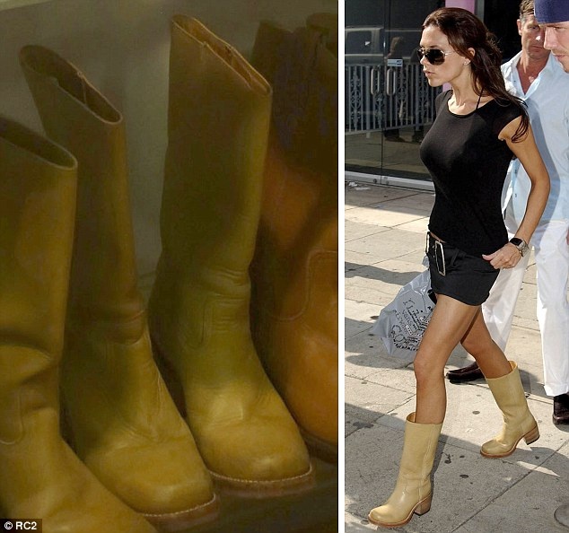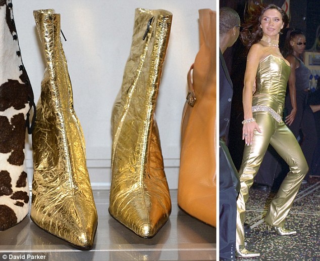 Đôi bốt ánh kim từng được Vic diện khi lưu diễn cùng ban nhạc Spice Girls năm 2000 tại Astoria, Mỹ nằm ngay ngắn trên kệ.