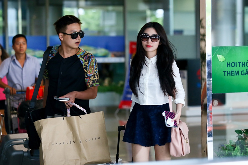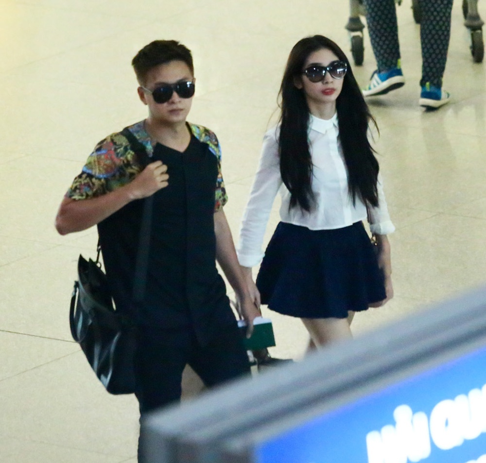 | Ngô Kiến Huy và Khổng Tú Quỳnh cùng sánh đôi rời khỏi sân bay. Cả hai quấn nhau không rời nửa bước trong suốt quá trình quay phim ở Singapore. |