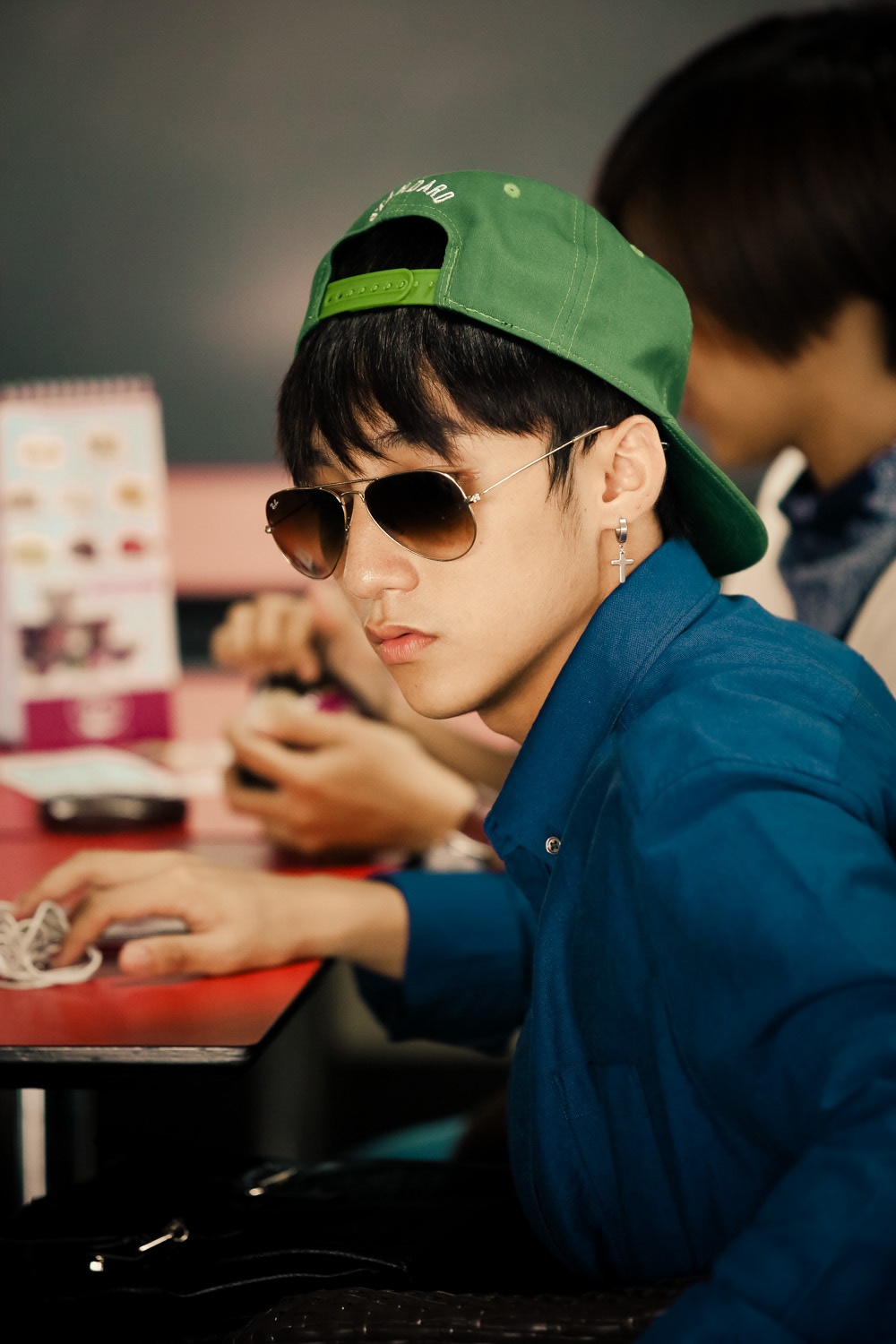 | Sau khi lấy hành lý, Sơn Tùng và ê-kíp nán lại sân bay để uống cà phê và ăn kem. Ngay cả khi ngồi nói chuyện với mọi người trong đoàn phim, Sơn Tùng cũng đeo kính. Được biết, đây chính là một trong những thói quen của nam ca sĩ sinh năm 1994. |