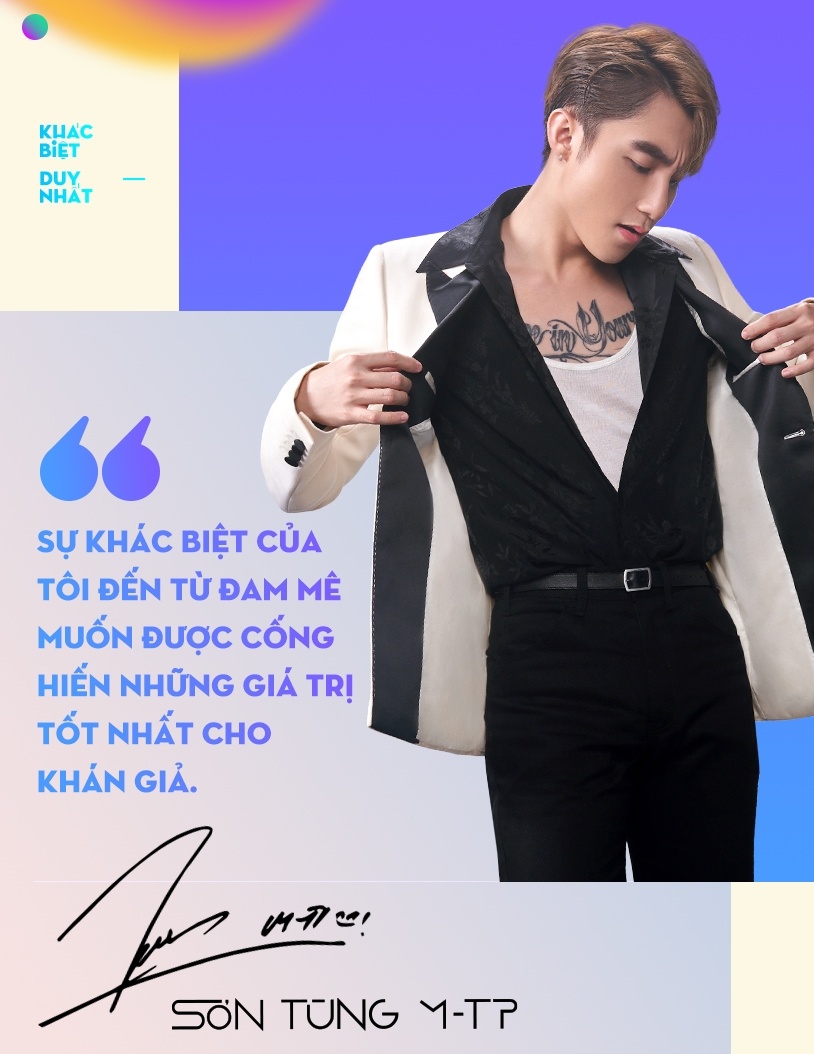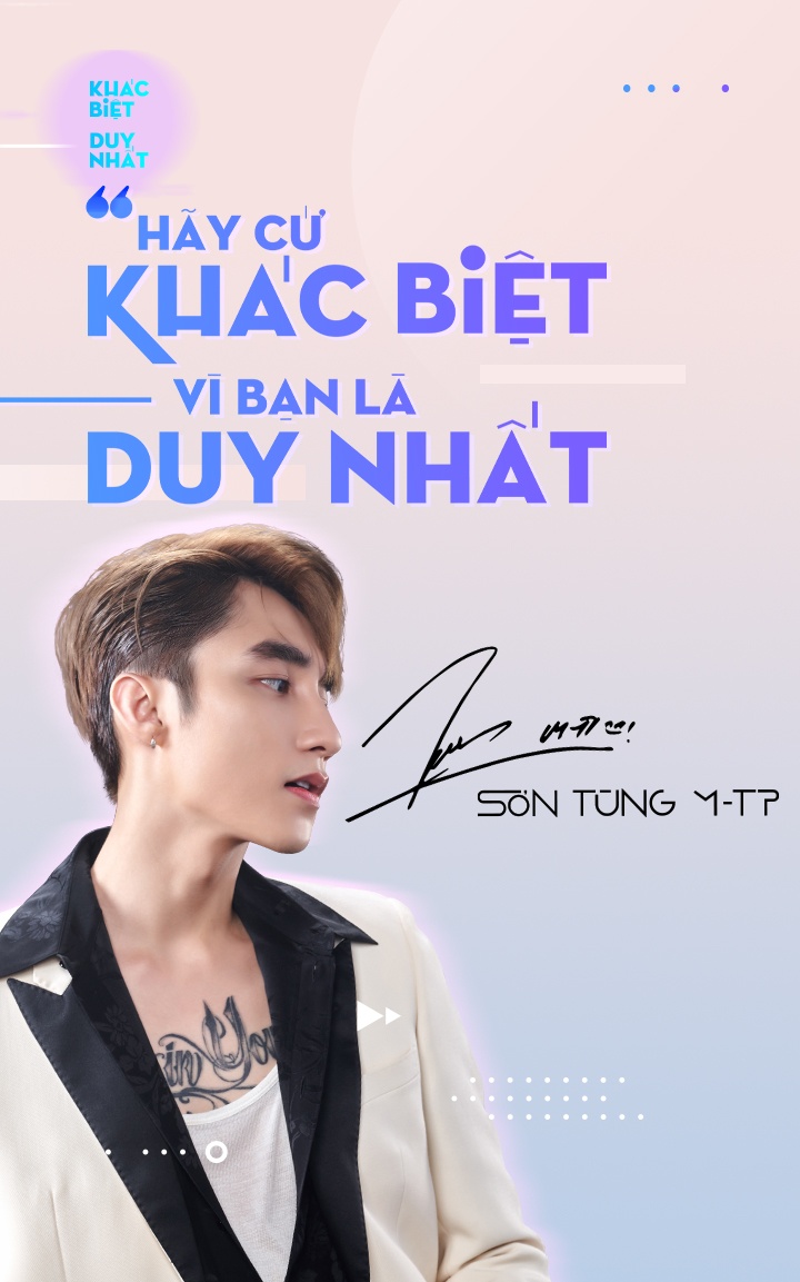 Điều làm nên một Sơn Tùng M-TP thành công như hôm nay có thể là tài năng, may mắn nhưng chắc chắn không thể thiếu đi cái tôi khác biệt. “Mỗi đỉnh núi bạn chinh phục đều có cái giá phải trả khác nhau. Thế nhưng thay vì nhìn vào những áp lực và cô đơn, tại sao bạn không nghĩ về chặng đường mà bản thân sắp trải nghiệm và trưởng thành? Đó chắc chắn là những bài học vô giá. Vậy nên, bạn hãy cứ khác biệt trên hành trình mình đã chọn vì bạn là duy nhất”, Sơn Tùng M-TP chia sẻ về triết lý sống của mình.