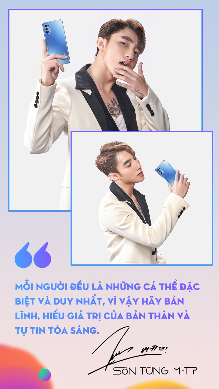 Giải thích về lý do chọn Oppo, nam ca sĩ chia sẻ: “Tôi rất thích tinh thần của Oppo Reno4 - Tôi nổi bật, tạo khác biệt. Thông điệp này đúng với con người và năng lượng mà tôi muốn mang đến cho mọi người. Mỗi người đều là những cá thể đặc biệt và duy nhất, vì vậy hãy bản lĩnh, hiểu giá trị của bản thân và tự tin tỏa sáng. Không một ai là không có giá trị. Biết trân trọng và thương yêu bản thân mình, giá trị của bạn sẽ tỏa sáng. Bạn luôn có thể là người đi đầu, nhưng trước hết, bạn cần phải đi đã”.