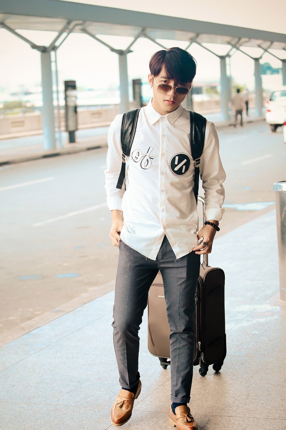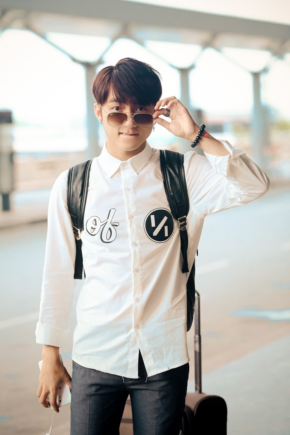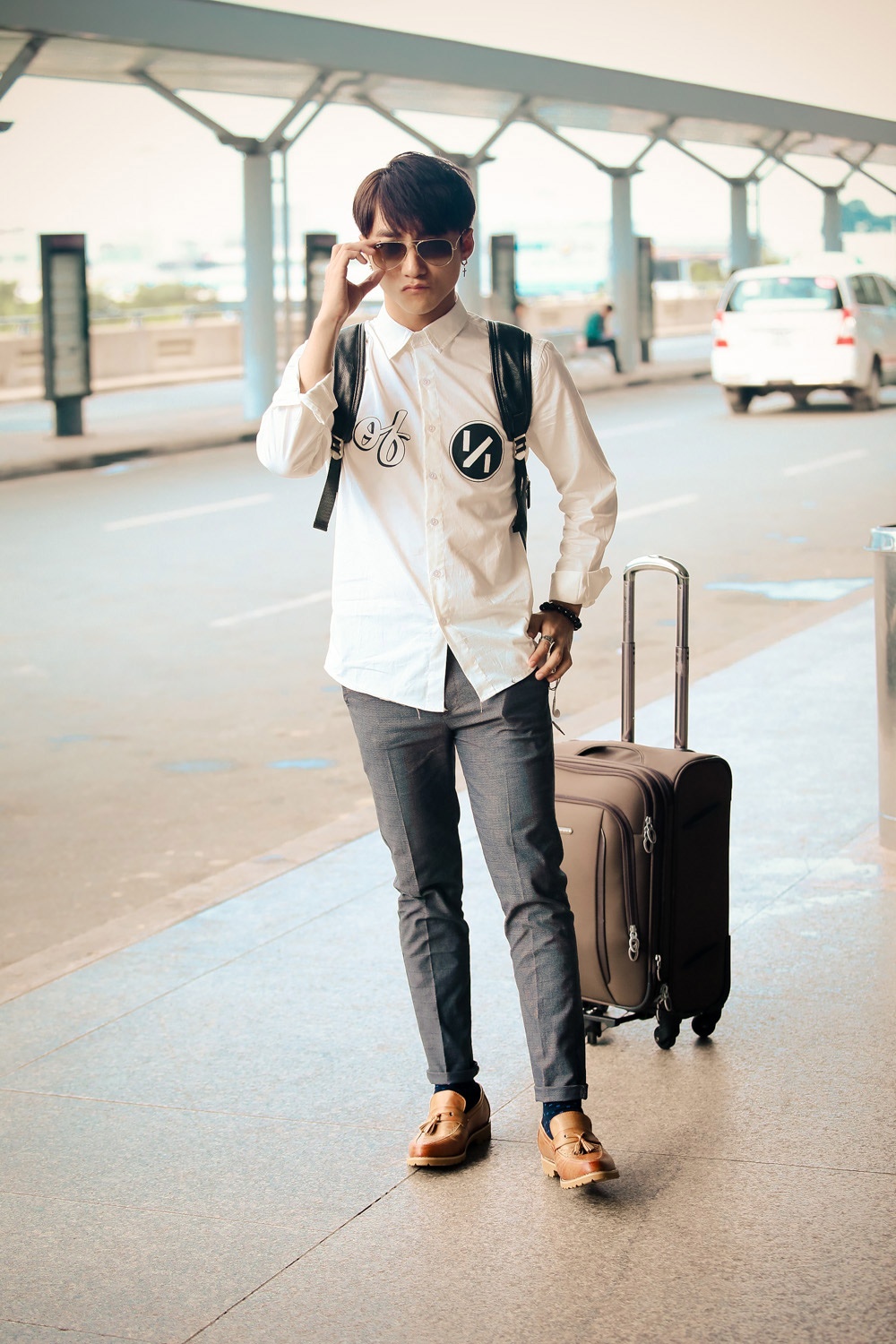 | Sơn Tùng ăn mặc cá tính và trẻ trung khi xuất hiện tại sân bay sáng nay. Dù diện sơ mi với quần tây nhưng những phụ kiện như kính mắt, bông tai, tai phôn và vòng tay không thể thiếu với anh. |