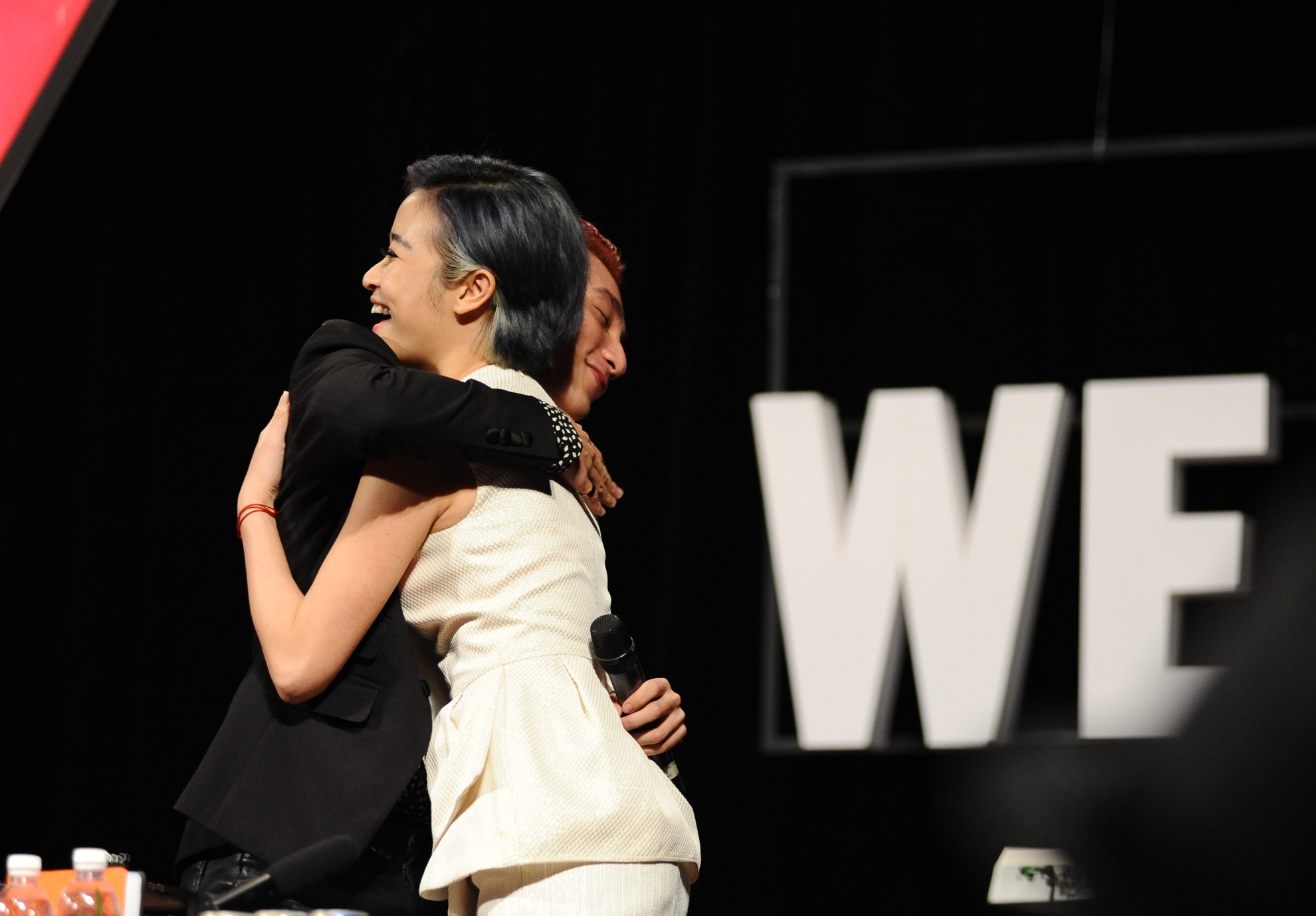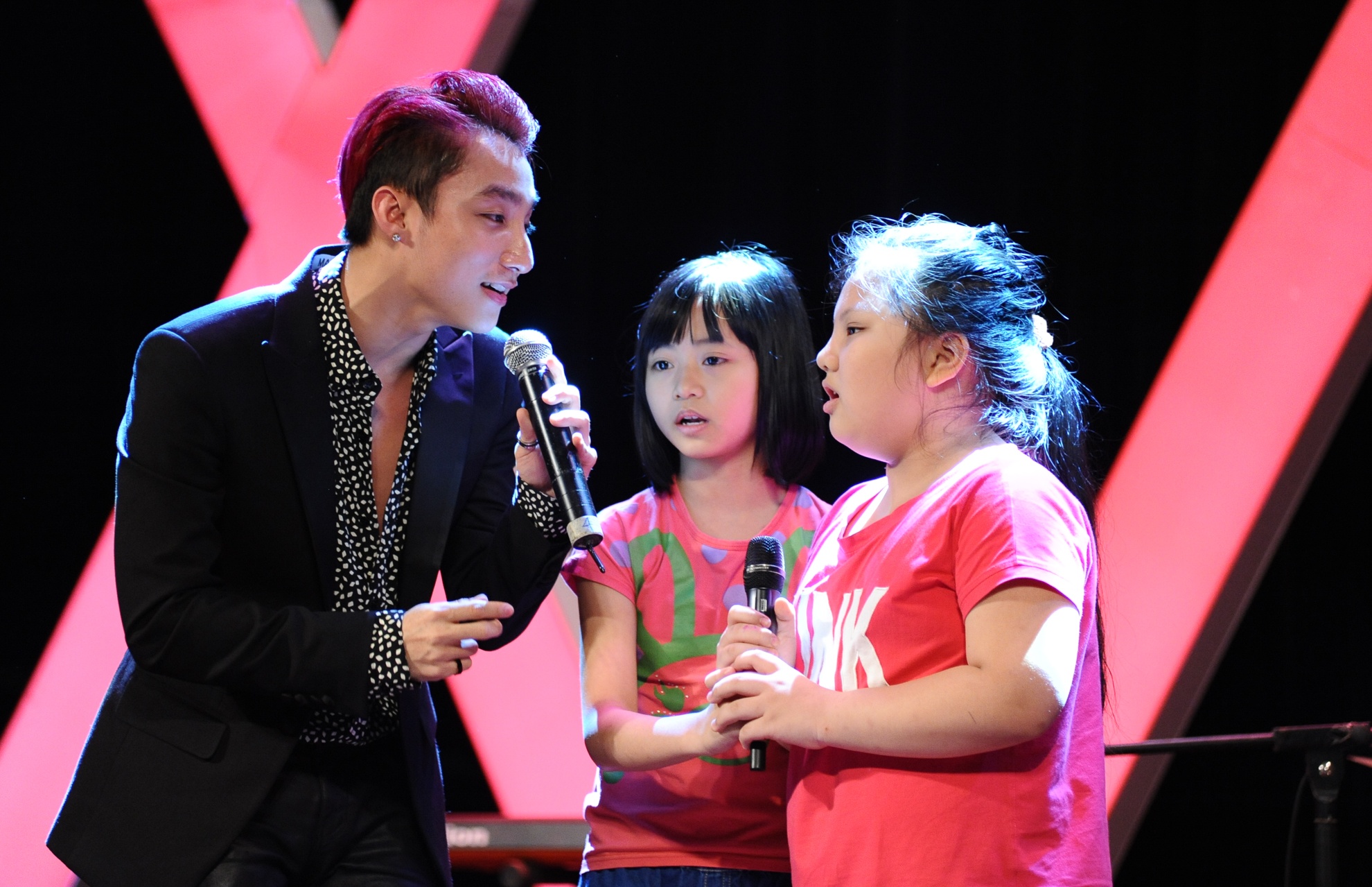 Hai khán giả nhí đã làm cho ca sĩ Em của ngày hôm qua” bất ngờ khi mới học lớp 4 mà đã thuộc làu ca khúc Buông đôi tay nhau ra”. Sơn Tùng không ngần ngại ký tặng hai fan nhí. |