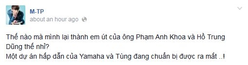 | Sau đó, trên trang Facebook của Sơn Tùng M-TP cũng xuất hiện hình ảnh tương tự cùng với chia sẻ về việc trở thành "em út" của Phạm Anh Khoa và Hồ Trung Dũng, trong một dự án hấp dẫn cũng của nhãn hàng. |