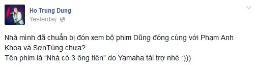 | Hồ Trung Dũng viết về một dự án mà anh gọi đùa là phim “Nhà có 3 ông tiên” do Yamaha tài trợ. |