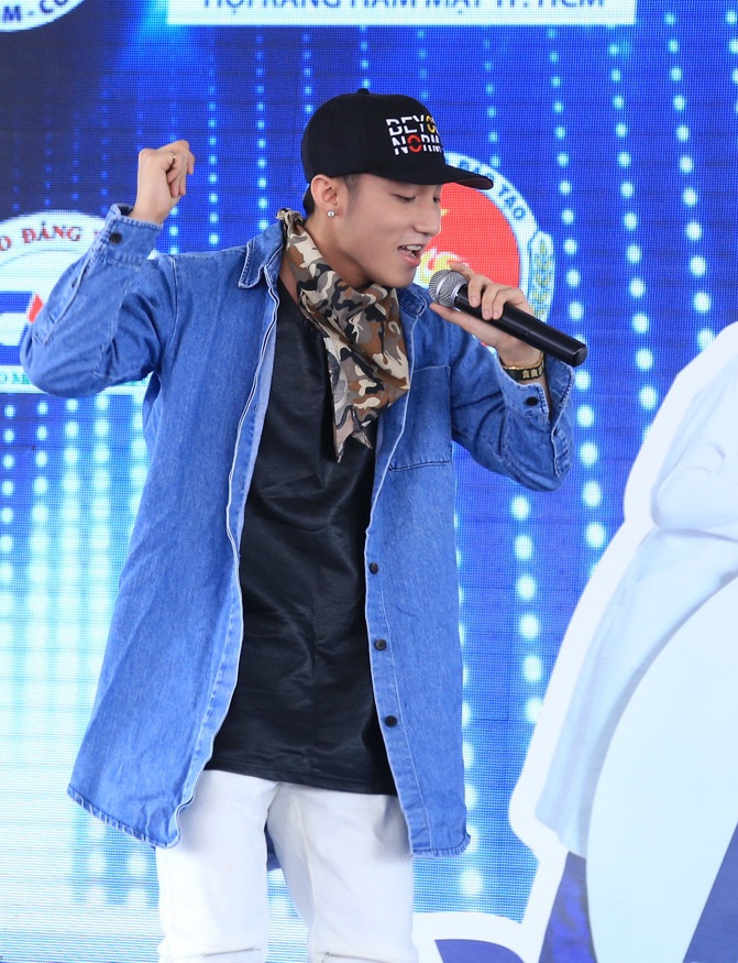 | Nam ca sĩ diện trang phục bụi phủi, năng động khi tham gia biểu diễn sân khấu ngoài trời, nhân sự kiện Ngày sức khoẻ răng miệng thế giới do một nhãn hàng kem đánh răng kết hợp với Hội răng hàm mặt Việt Nam tổ chức. |