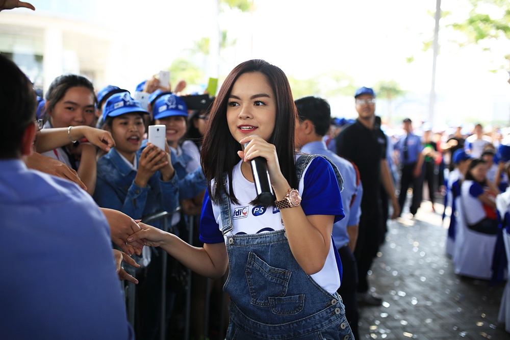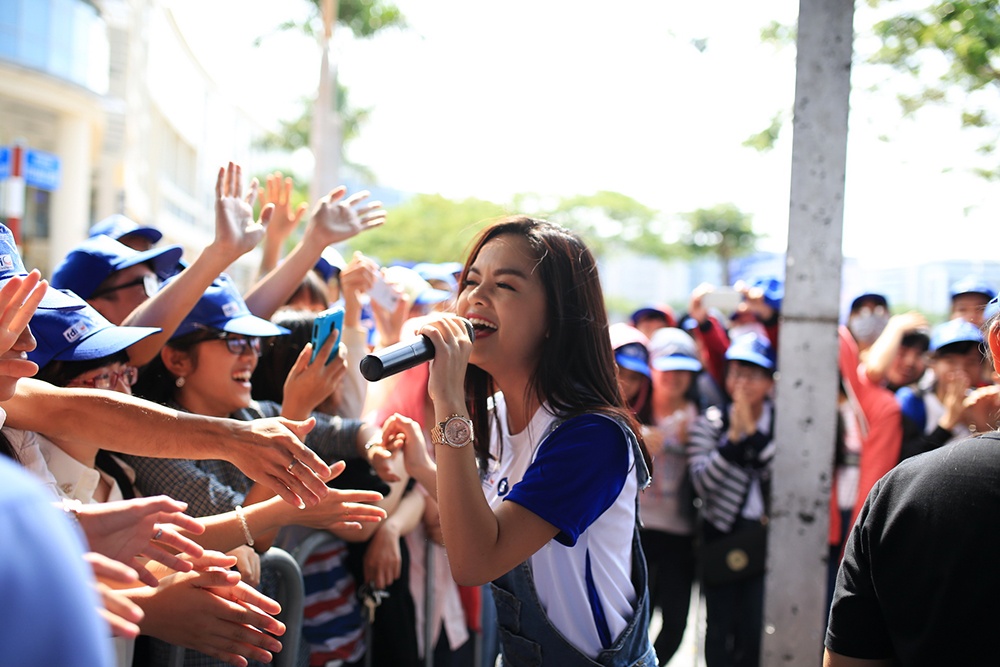 | Cô còn cùng với dàn ca sĩ bước ra từ cuộc thi The Voice Kids như quán quân mùa đầu tiên Quang Anh, á quân Hoàng Anh của mùa 2 và Đức Anh tham gia đi bộ cùng hàng ngàn khán giả. |