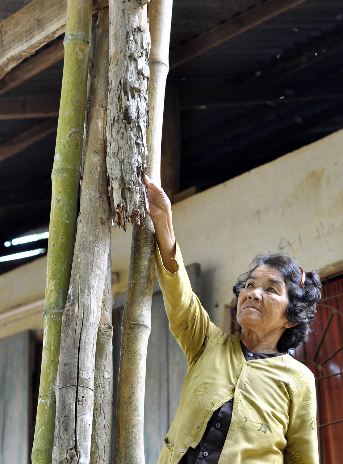 | Cột gỗ chống đỡ mái hiên nhà bà Trần Thị Thanh bị hư hỏng. Ảnh: Ngọc An |