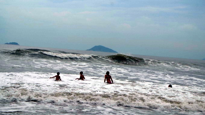 | Tại biển Cửa Đại (phường Cửa Đại, TP Hội An), nhiều khách du lịch và người dân, trong đó có nhiều trẻ em vẫn bất chấp những đợt sóng nguy hiểm ra biển tắm. |