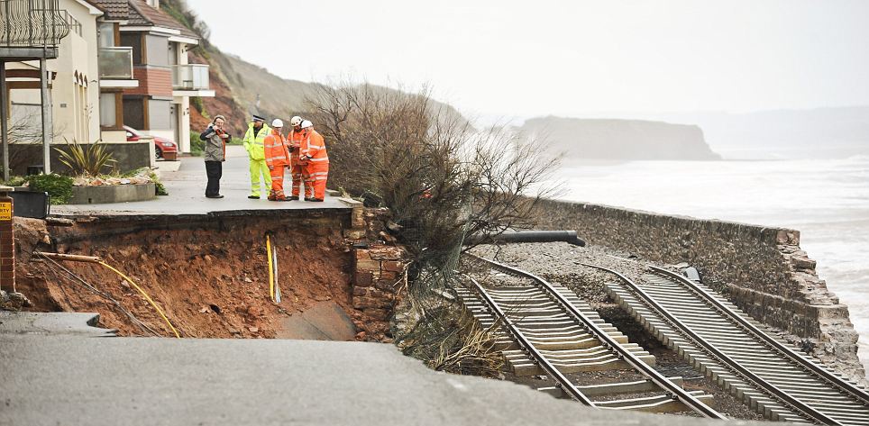Đường tàu tại Dawlish hư hỏng nặng. Tàu chạy qua đoạn đường này sẽ phải ngừng hoạt động trong một thời gian. Ảnh: Daily Mail.