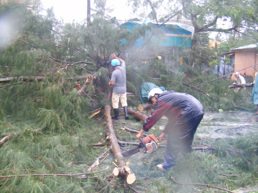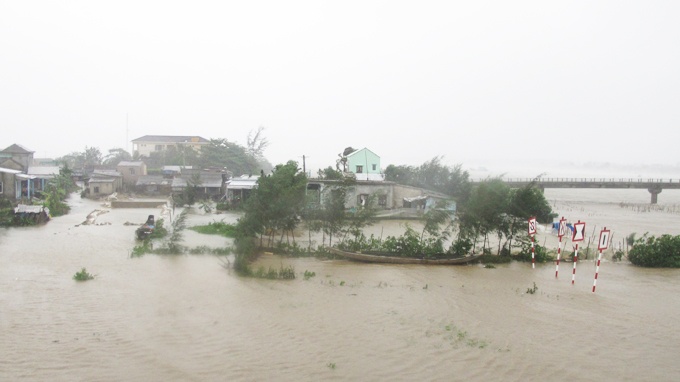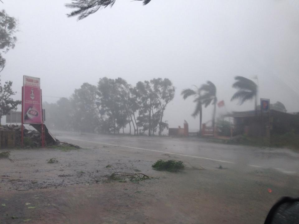 Toàn huyện Lệ Thủy (Quảng Bình) bị cúp điện, chia cắt. Bà con nghe tin bão qua radio dùng năng lượng pin. Trên quốc lộ 1A đoạn đi qua huyện Lệ Thủy xế chiều 30/9 hầu như không một bóng người. Gió biển rít khủng hoảng. Những tấm tôn trên mái của UBND huyện Lệ Thuỷ đang sắp bung, cuốn theo bão. Trưa 30/9, theo ghi nhận tại huyện Kỳ Anh (Hà Tĩnh) đã có mưa bão. Đi xe từ thị trấn Kỳ Anh xuống cảng Vũng Áng, cây cối hai bên đường bị gió bão quật gãy ngổn ngang, không còn bóng ai trên đường. Một số quán hàng nằm dọc đường bị gió đánh tốc mái, bảng hiệu bị gió cuốn bay hàng chục mét. Ảnh: Tuổi Trẻ.