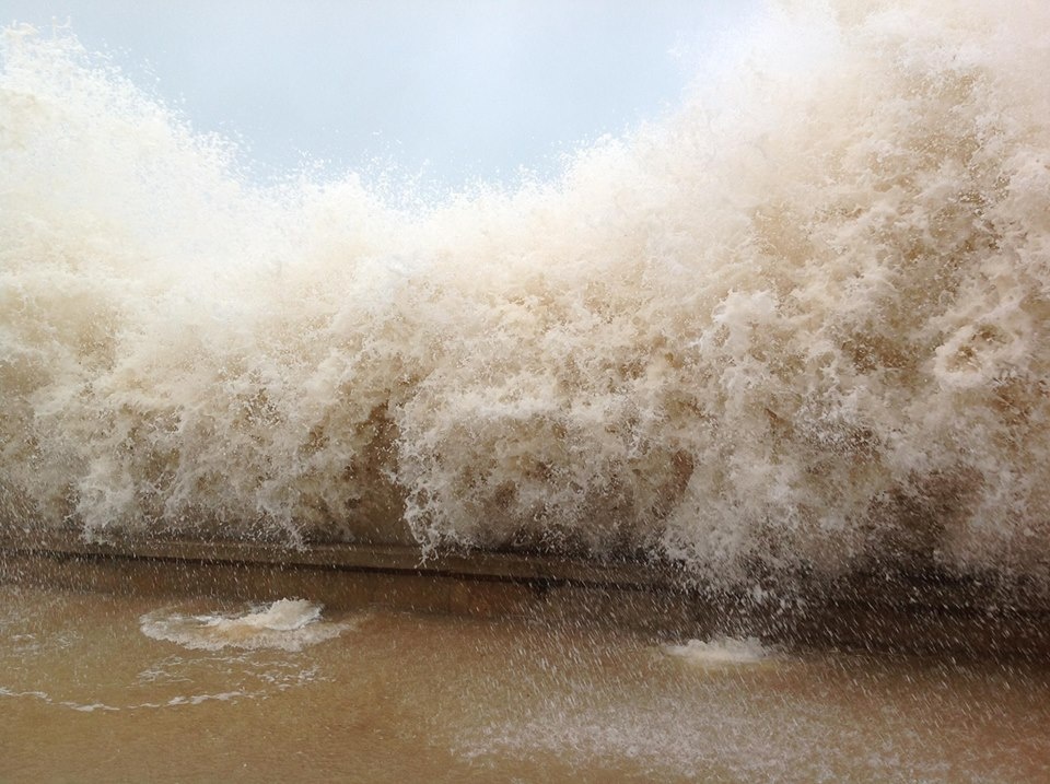 Tại Đức Trạch, huyện Bố Trạch, người dân đang chứng kiến những con sóng bạc đầu cao hơn chục mét xô vào bờ kè tung bọt trắng xóa.