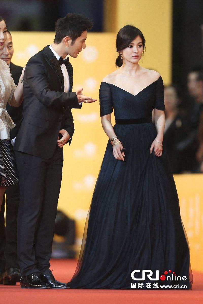 | Diện chiếc đầm hở vai tối màu, Song Hye Kyo sang trọng và quyến rũ trên thảm đỏ. Cô được Huỳnh Hiểu Minh - bạn diễn trong Thái Bình Luân (The Crossing) - chăm sóc rất ân cần. |