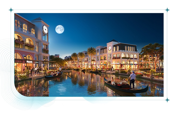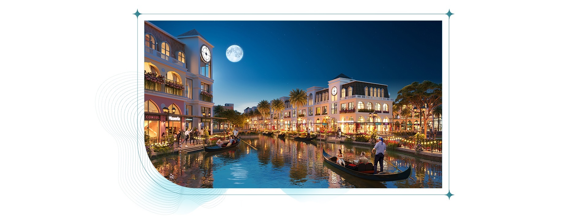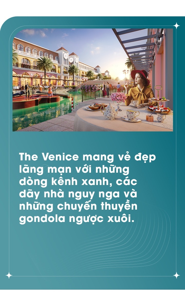 Venice được mệnh danh là thành phố tình yêu nhờ vẻ đẹp thơ mộng hiếm nơi nào có được. Lấy cảm hứng từ những biểu tượng của thành phố này, The Venice gợi lên khung cảnh lãng mạn với những chuyến thuyền gondola ngược xuôi trên dòng kênh xanh hiền hòa, uốn quanh các công trình nguy nga và dãy nhà được xây dựng theo phong cách kiến trúc Art Deco, Venetian Gothic.