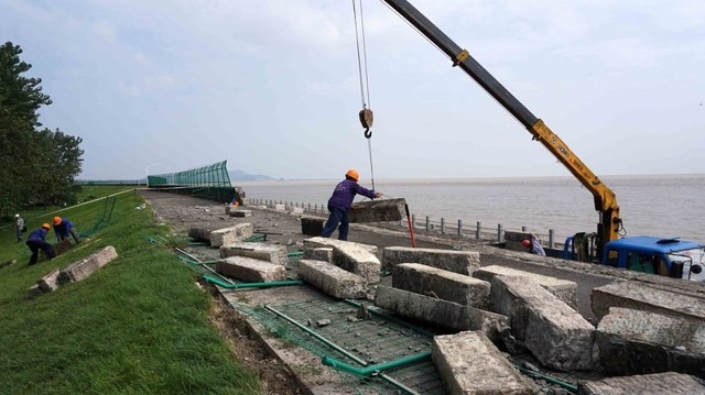 Những con sóng dữ liên tiếp ập vào bờ kè trên sông Tiền Đường, khiến nước đục ngàu phù sa tràn lên tuyến đường nằm sát bờ sông. Tiền Đường là dòng sông lớn nhất ở tỉnh Chiết Giang, Trung Quốc. |