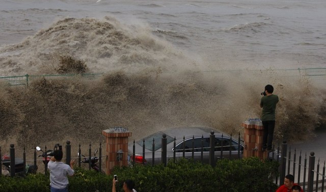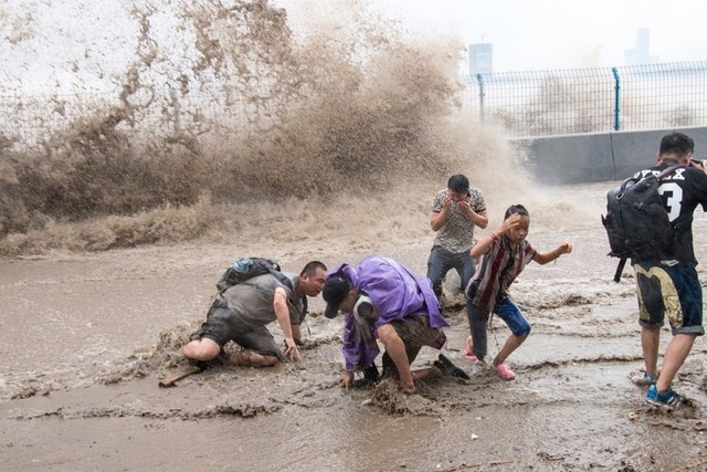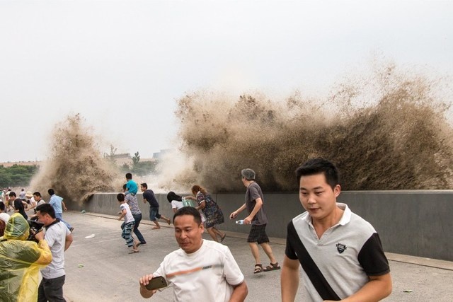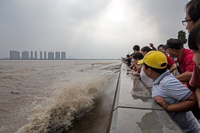 Sóng mạnh như những con “quái vật” chồm lên những người hiếu kỳ. Theo lý giải khoa học, thủy triều ở sông Tiền Đường lớn bất thường là do khu vực này có đặc điểm địa hình, thủy văn, khí hậu đặc biệt. |