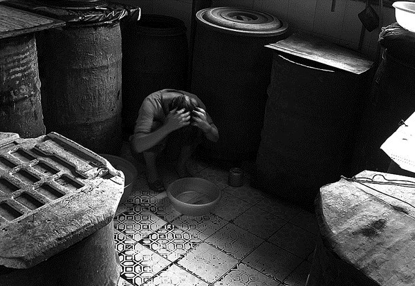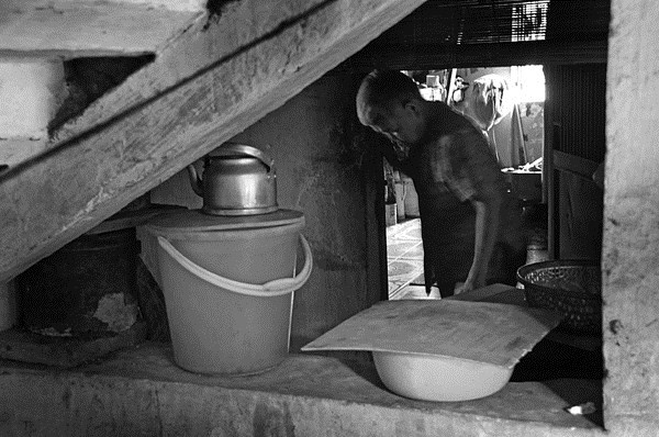 | Do sử dụng chung công trình phụ nên mỗi hộ đều có một thùng phuy riêng để tích trữ nước, khiến công trình phụ càng chật chội hơn. |