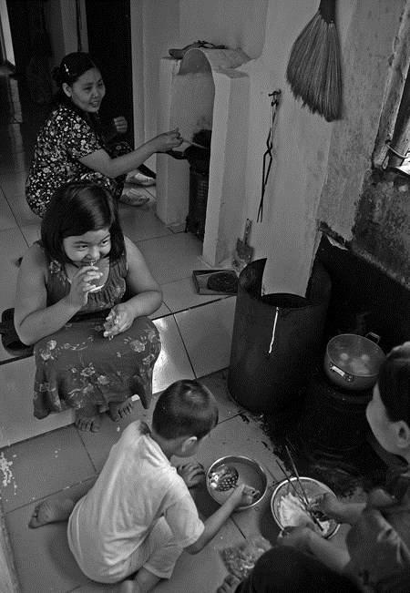 | Buổi chiều, hành lang của các tòa nhà luôn nhộn nhịp với cảnh nấu cơm, vui chơi của trẻ nhỏ. Trong ảnh, các gia đình ra hành lang tầng 3 nhà A1 nấu cơm. |