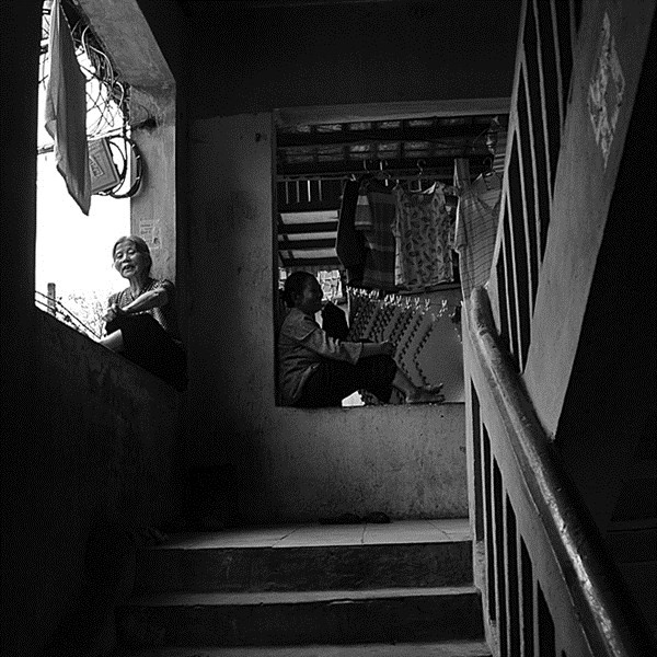 | Ngày cuối tuần, người già trong khu tập thể thường ra chiếu nghỉ, ban công ngồi trò chuyện. |