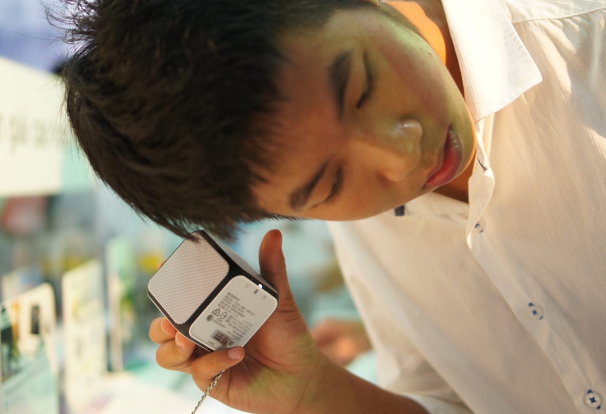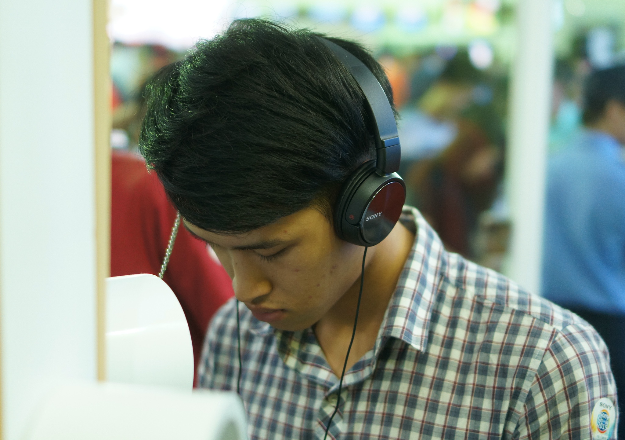 | Một tín đồ âm thanh trải nghiệm tai nghe công nghệ Hi-res của Sony. |