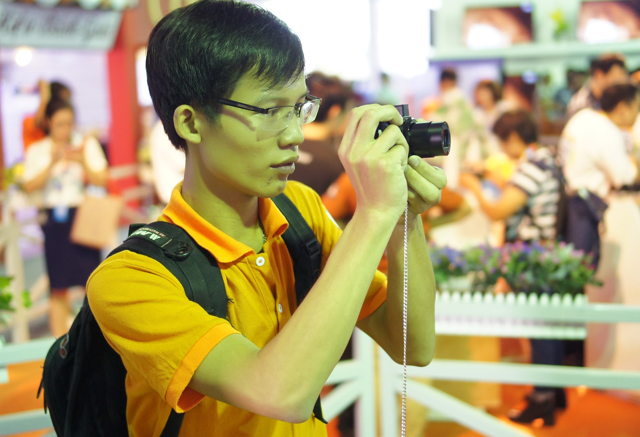 | Bạn Đặng Ngọc Sang - sinh viên năm cuối đại học Mỏ - Địa chất đang trải nghiệm chiếc máy ảnh compact Sony RX100 IV. Model này có giá 23 triệu đồng tại Việt Nam. |