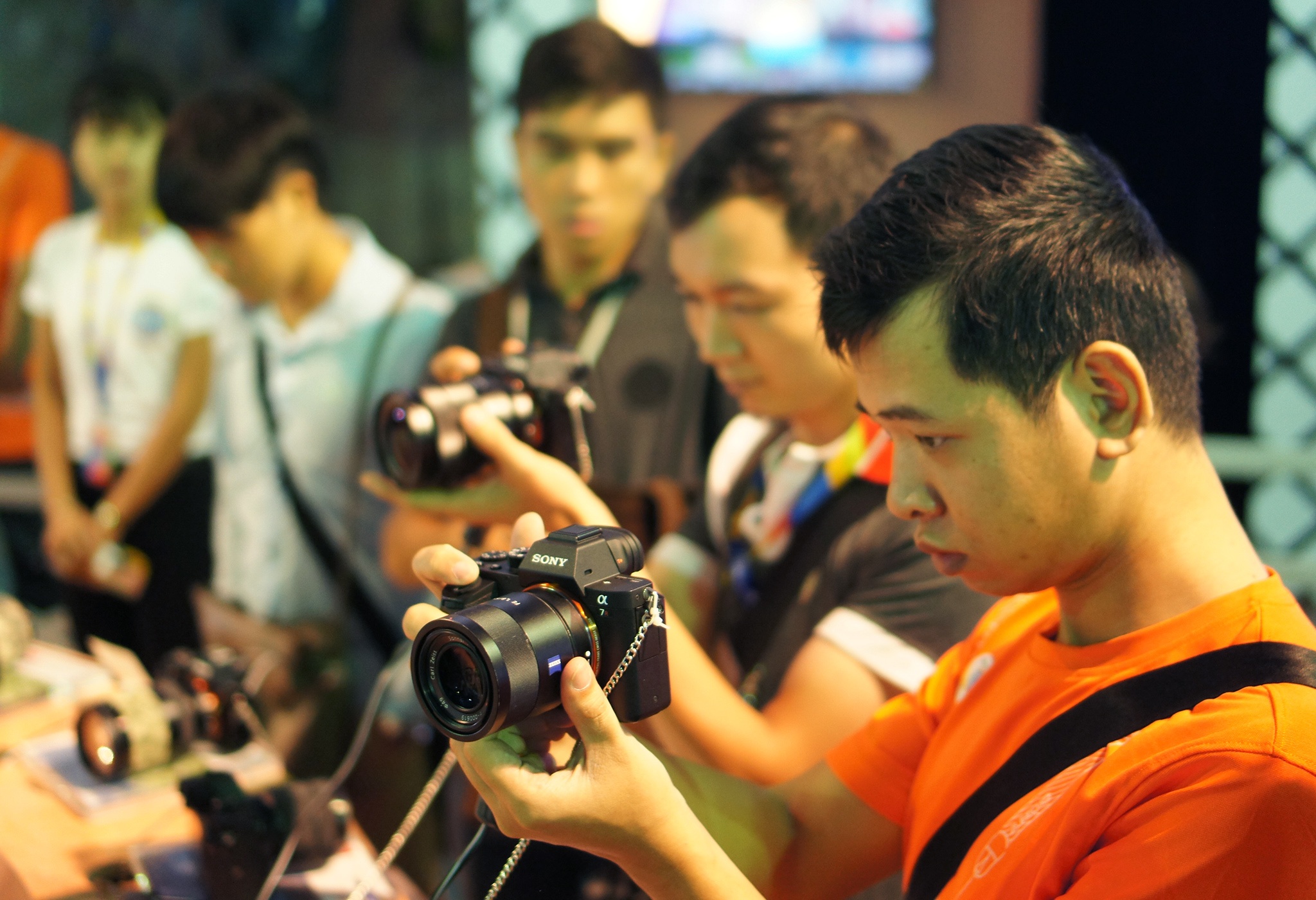 | Sau khu vực trải nghiệm Xperia, khu trưng bày các dòng máy ảnh Alpha là điểm thu hút khách đông thứ 2. Những model như Sony A7R (trên hình) có giá bán khá cao, không phải đối tượng người dùng nào cũng tiếp cận được. |