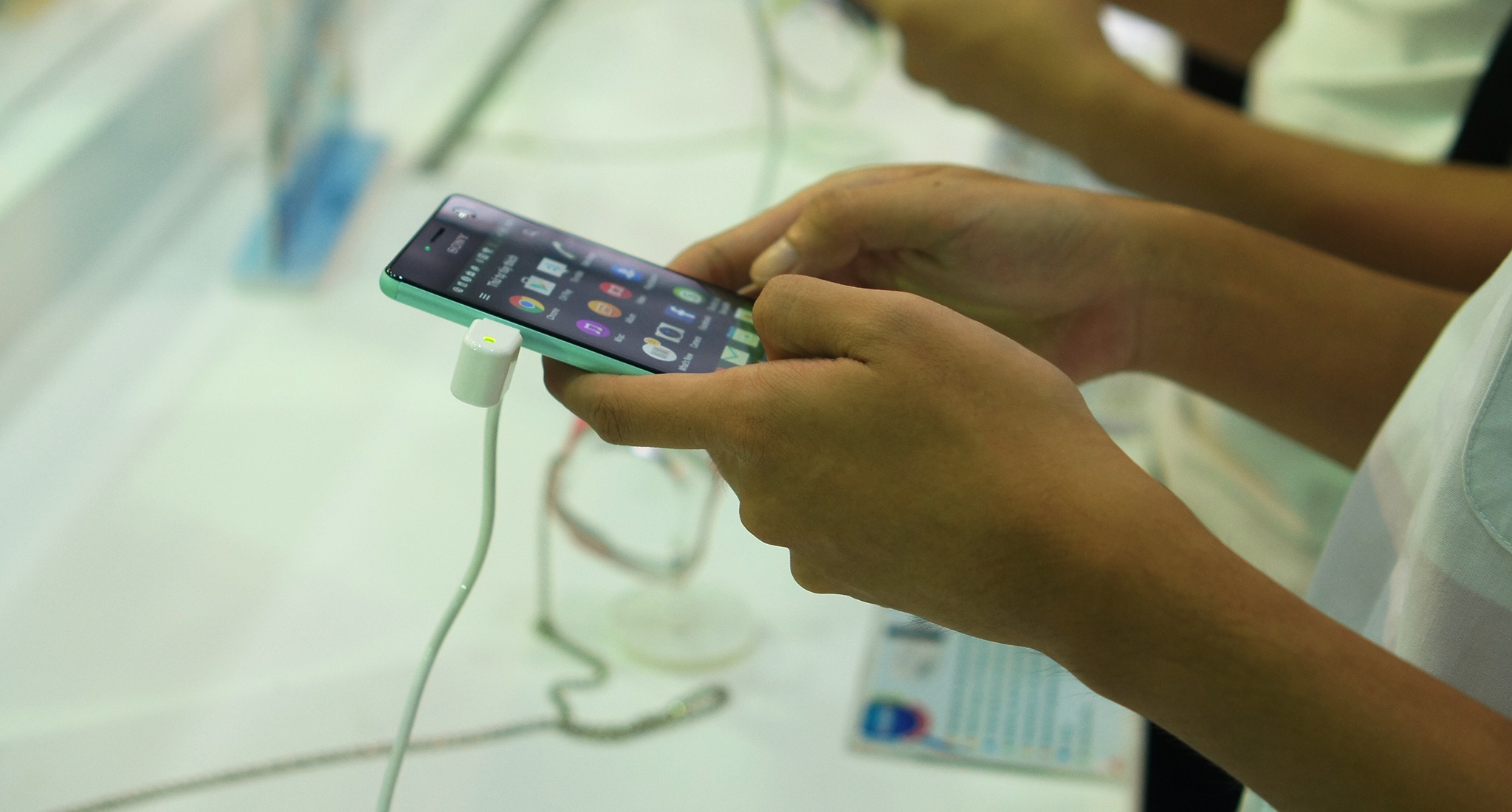 | Một chiếc Sony Xperia C4 màu xanh bạc hà nổi bật. Đây là model chuyên chụp ảnh tự sướng của Sony. |