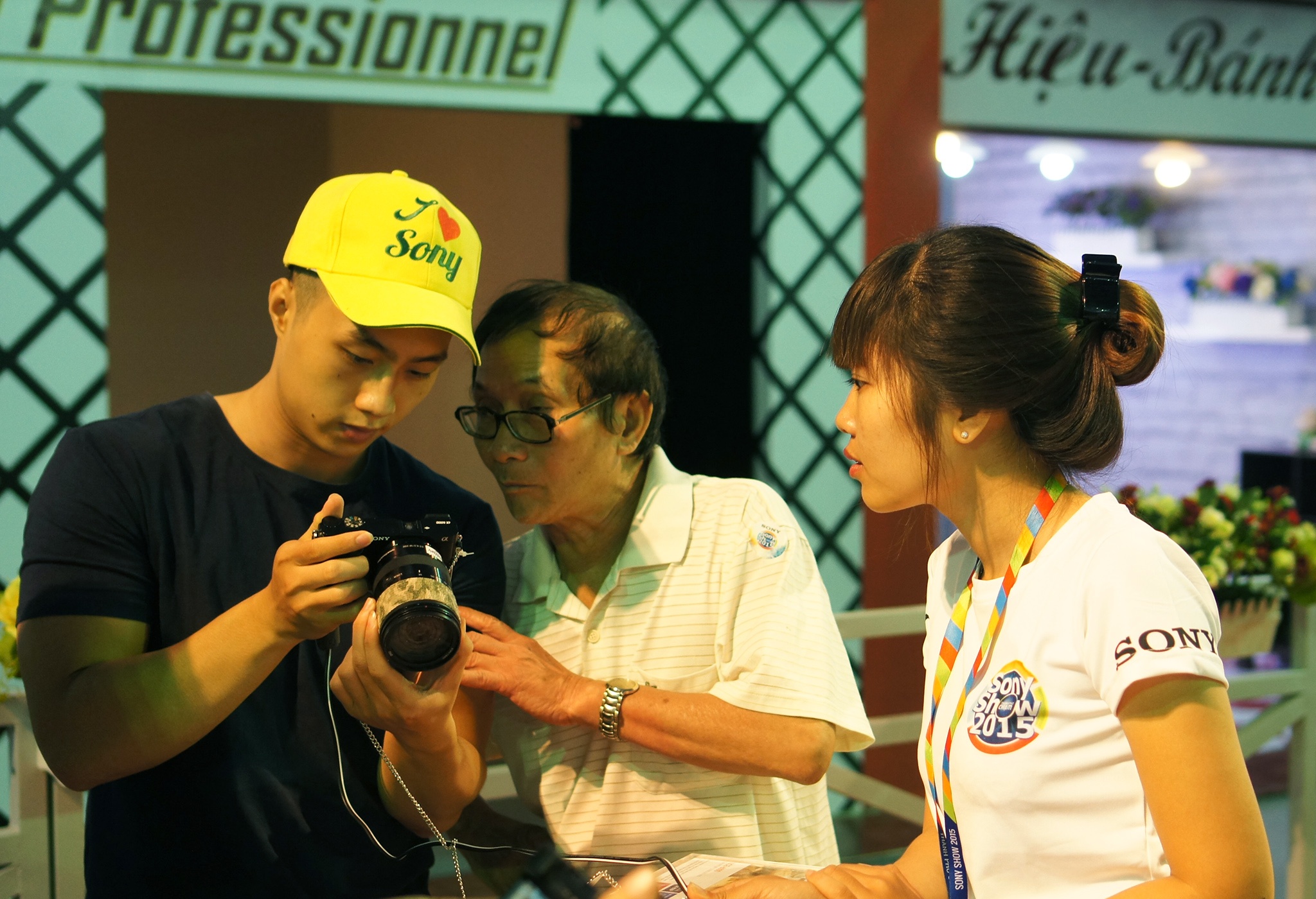 | Cha con bác Tống Văn Đàm cùng trải nghiệm một chiếc Alpha A6000 - mẫu máy mirrorless nổi tiếng của Sony. |