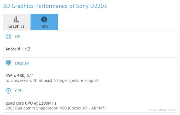 Sony D2203 được trang bị đầy đủ Bluetooth, GPS, NFC và Wi-Fi. Bản mẫu của sản phẩm này đang chạy nền tảng Android 4.4.2 KitKat. Với cấu hình thấp, đây chắc chắn là một model nhắm vào phân khúc giá rẻ của Sony.