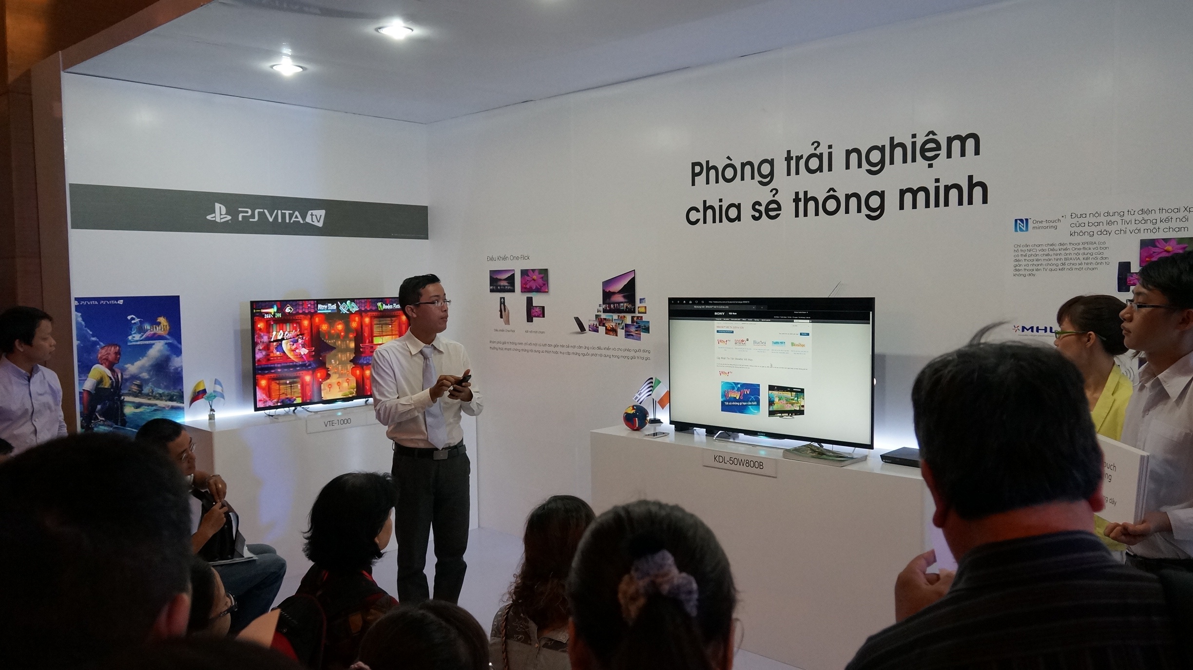 | Bên ngoái sân khấu, hãng này trình bày các phòng trải nghiệm từ âm thanh, hình ảnh đến khả năng kết nối với máy ảnh, smartphone, máy chơi game. |