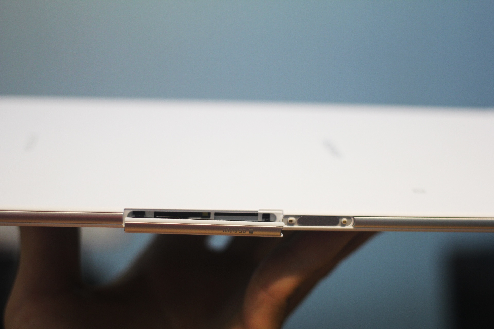 | Cạnh trái là khe cắm thẻ, thiết bị này hỗ trợ thẻ microSD ngoài lên đến 128 GB. |