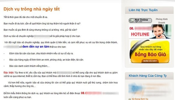 Chỉ cần gọi điện vào số hotline hoặc vào web của của các công ty cung cấp dịch vụ này, bạn sẽ thấy những quảng cáo “bùi tai” và rất có lý như: “Tết năm 2014 sắp tới! Nhiều gia đình không có người giúp việc, có nhiều gia đình về thăm quê hương đất tổ, vui Tết bên gia đình, người thân, một số gia đình lại tranh thủ đi du lịch đây đó. Dù đi đâu về đâu, quý vị vẫn không thể yên tâm nếu không có người giúp việc. Ngôi nhà của bạn sẽ rất lạnh nếu không có người trông coi hương khói ngày Tết, đàn chó cưng, chim kiểng, cá kiểng, vườn tược tất cả sẽ bị bỏ rơi, tài sản quý giá trong ngôi nhà thân yêu của bạn sẽ có nguy cơ 'bốc hơi'… Nhưng quý vị đừng lo. Với nhiều năm kinh nghiệm, cùng đội ngũ vệ sĩ giỏi chuyên môn, nhiệt tình phục vụ các gia đình trong ngày Tết, chúng tôi sẽ luôn đáp ứng được nhu cầu của quý vị. Quý vị sẽ có một cái Tết vui vẻ và an tâm hơn bao giờ hết...”.