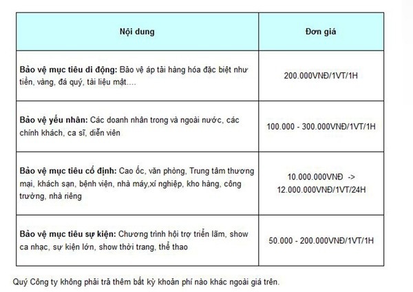 | Bảng giá dịch vụ của một công ty bảo vệ, trong đó, bảo vệ nhà riêng có giá 10 - 12 triệu đồng/24 giờ. |