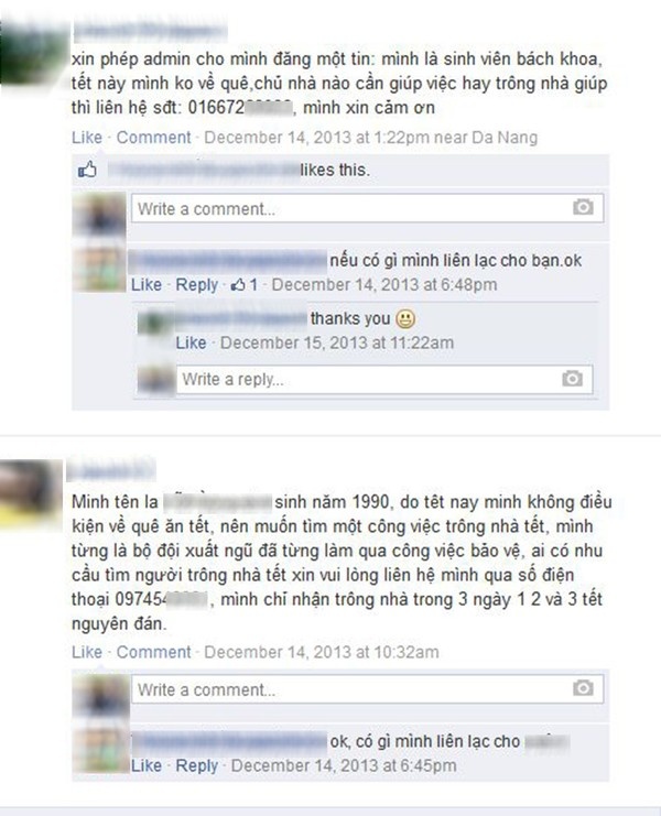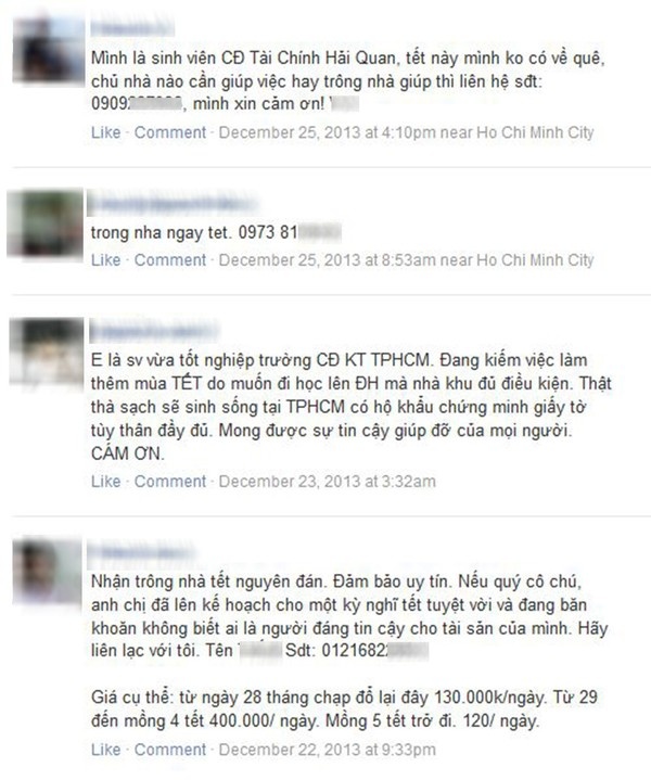 Những ngày này, có thể thấy trên các trang rao vặt la liệt các mẩu tin như: “P. T nhận trông nhà Tết nguyên đán. Đảm bảo uy tín. Nếu quý cô chú, anh chị đã lên kế hoạch cho một kỳ nghỉ Tết tuyệt vời và đang băn khoăn không biết ai là người đáng tin cậy cho tài sản của mình, hãy liên lạc với tôi theo số điện thoại: 0121682xxxx. Giá cụ thể: từ ngày 28 tháng chạp đổ lại đây: 130.000 đồng/ngày, từ 29 đến mồng 4 Tết: 400.000 đồng/ngày, từ mồng 5 Tết trở đi: 120.000 đồng/ngày”; hoặc: “Hiện tại em là sinh viên mới ra trường. Ngoại hình to, cao 1m80, nặng 75 kg. Do nền kinh tế suy thoái gặp nhiều khó khăn, muốn tìm việc làm thêm ngày Tết. Em nhận trông nhà ngày Tết Nguyên đán 2014 cho gia đình. Anh/chị nào cần giúp gia đình hương khói trong ngày Tết Nguyên đán 2014, thắp nhang đơn giản và dọn dẹp nhà cửa sạch sẽ, chăm sóc chó mèo, chăm sóc cây cảnh và khuôn viên để cho anh/chị được yên tâm đón một cái Tết Nguyên đán an khang thịnh vượng, em hứa sẽ chăm sóc an toàn, cẩn thận, chu đáo. Em có thể đặt giấy tờ tùy thân để làm tin. Hiện em đang ở tại quận Tân Bình, TP.HCM, số điện thoại 093304xxxx”…