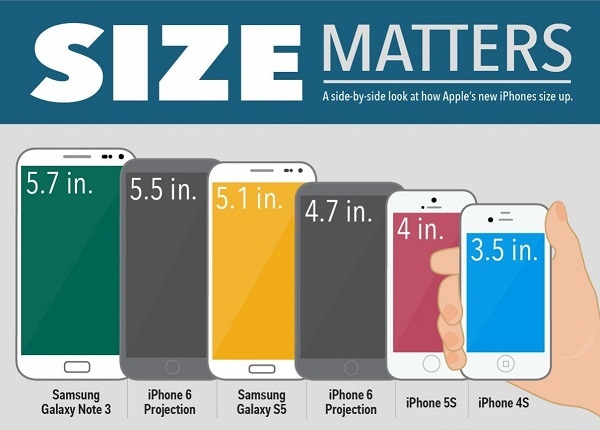 Mẫu điện thoại màn hình lớn đang dẫn đầu thị trường hiện nay, dĩ nhiên, là Samsung Galaxy S và Samsung Note, với màn hình cỡ từ 5 inch trở lên – như chiếc Samsung Note 4 hiện đã có kích thước màn hình lên tới 5,7 inch. Và khi hỏi những người dùng Note 4 rằng liệu họ có bao giờ nghĩ đến việc quay lại dùng một mẫu iPhone 4 inch nữa hay không, bạn sẽ thấy câu trả lời chủ yếu là "không".