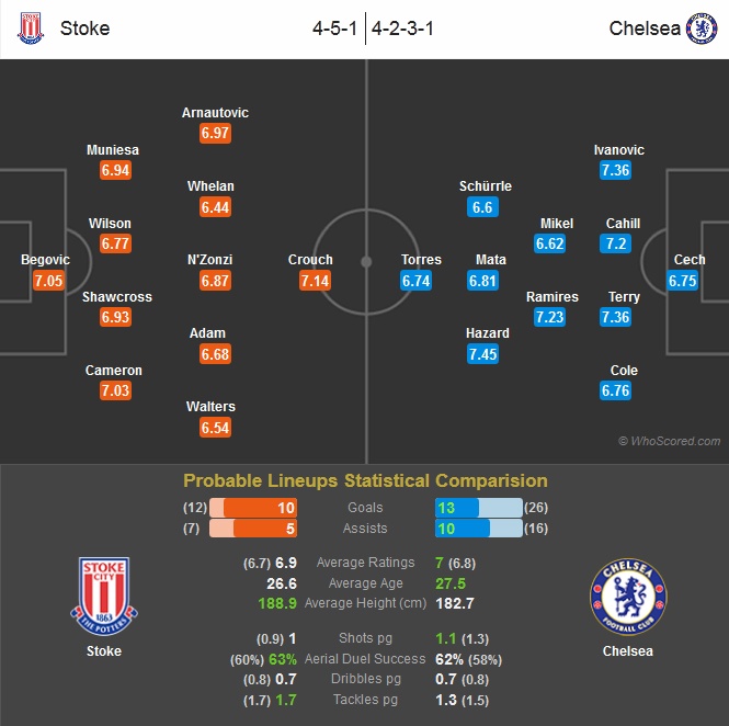 Khả năng giành chiến thắng của Chelsea trước Stoke được đánh giá khá cao với 3 lý do sau. Thứ nhất, đoàn quân do HLV Mourinho dẫn dắt hiện có phong độ thi đấu khá tốt. Trong chuyến đi tới sân Britannia, chiến lược gia người Bồ Đào Nha có sự phục vụ của các cầu thủ trụ cột ở 3 tuyến gồm như hậu vệ trái Ashley Cole, tiền vệ trung tâm Ramires, cầu thủ mới lập cú đúp Hazard và trung phong Torres.