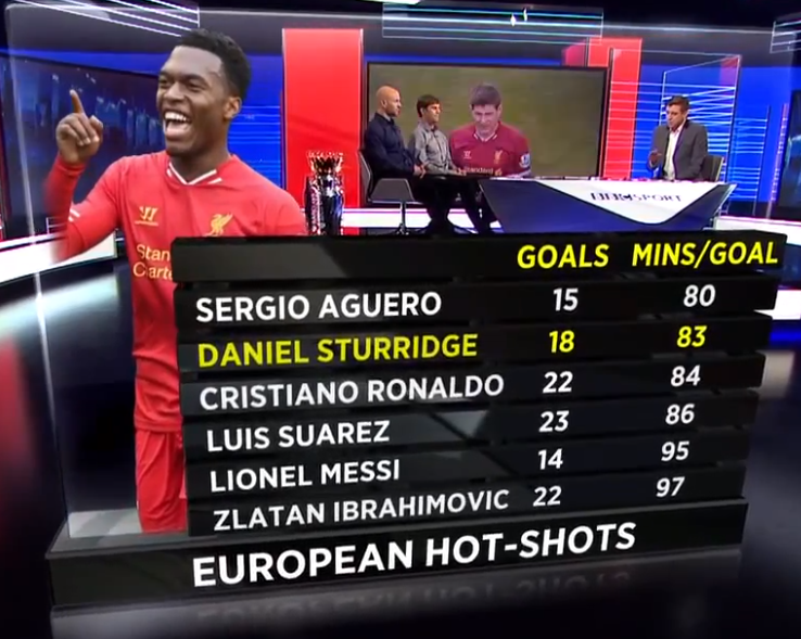 Sturridge đứng thứ hai trong bảng thống kê hiệu suất ghi bàn ở châu Âu. |