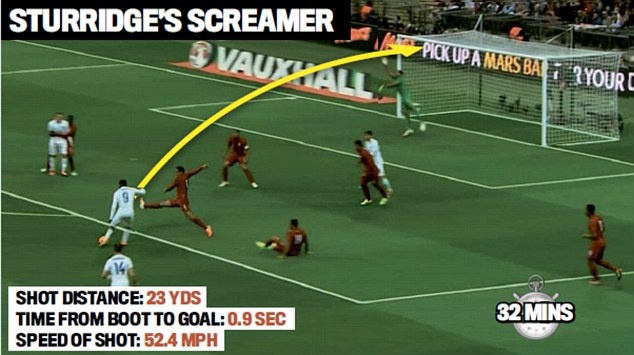 | Pha dứt điểm thần sầu của Sturridge có khoảng cách gần 18 m, thời gian bóng từ chân tiền đạo này đến khi bay vào lưới là 0,9 giây với tốc độ bay 83,8 km/h. |